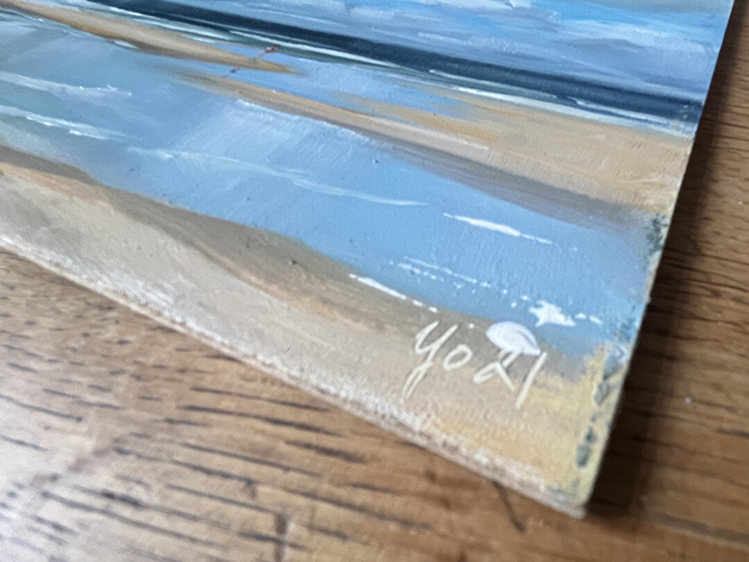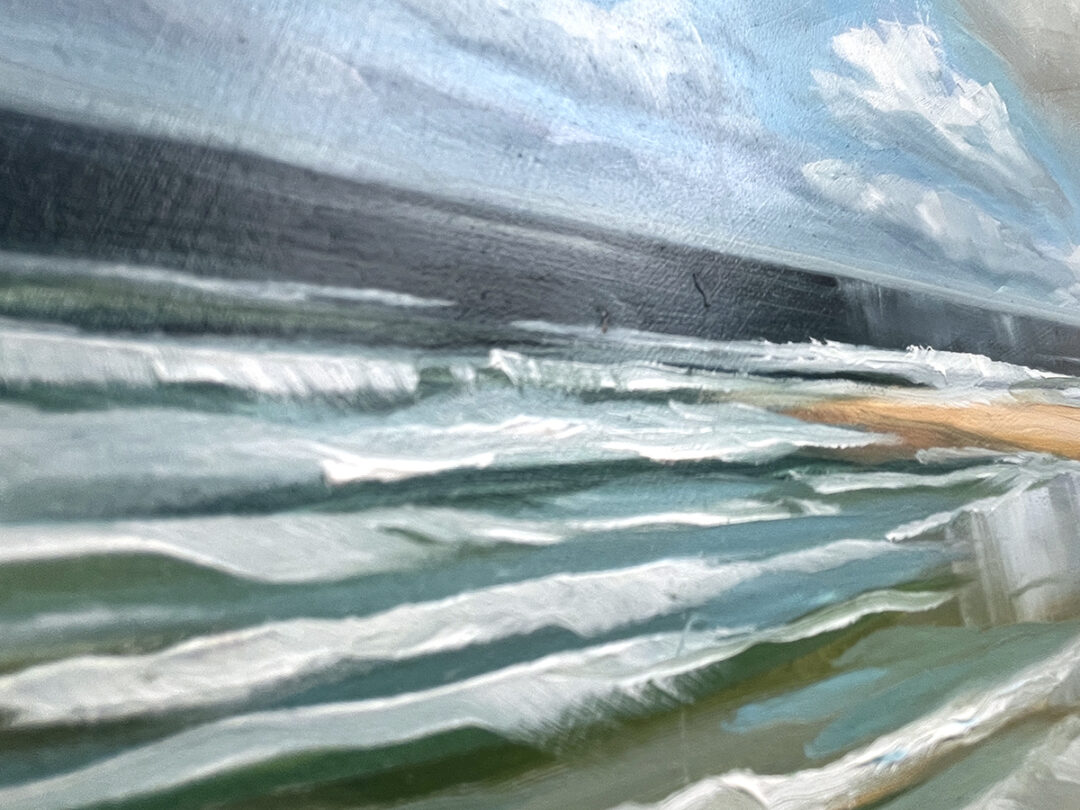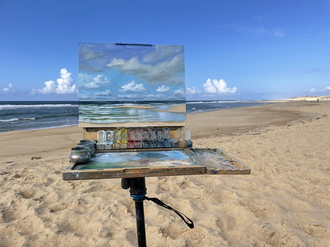 Dieses Bild malte ich an der französichen Atlantikküste, in der Nähe von Contis Plage (südlcih von Mimizan). Die kleine Figur auf der Ebbeinsel zeigt den Maßstab und so die unglaubliche Weite dort am Meer.