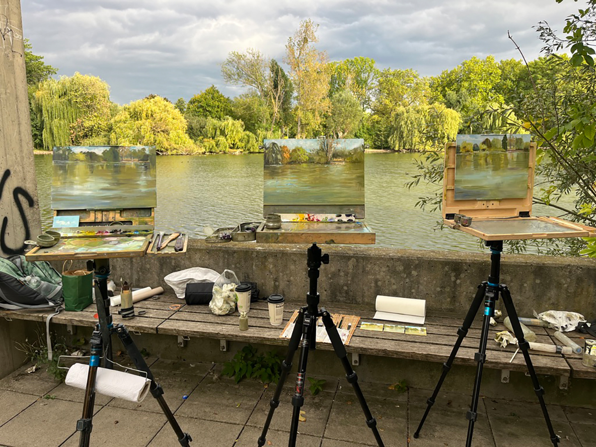 Einmal im Jahr gebe ich einen boesner Workshop bei mir in Frankfurt. Wir treffen uns in der Fililale im Atelier, wo ich euch alles über mein Pleinair Material zeige, und ihr euch gegebenenfalls euch noch eindecken könnt. Danach malen wir auf den nahegelegenen Streuobstwiesen: ich zeige euch wir ihr mit Hilfe einer Mini-Ölskizze (8x10cm) die Vereinfachung eures Motivs übt um es dann möglichst zügig, ohne euch in Details zu verlieren, auf eine ca DinA 4 große Malplatte malen könnt.